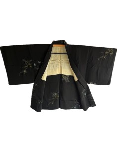 Elegant vintage haori for women in black Japanese silk, adorned with red azalea motifs symbolizing passion. Lined with pine branches for longevity and strength. A rare Showa-era piece, ideal for lovers of Japanese tradition and refined aesthetics.
