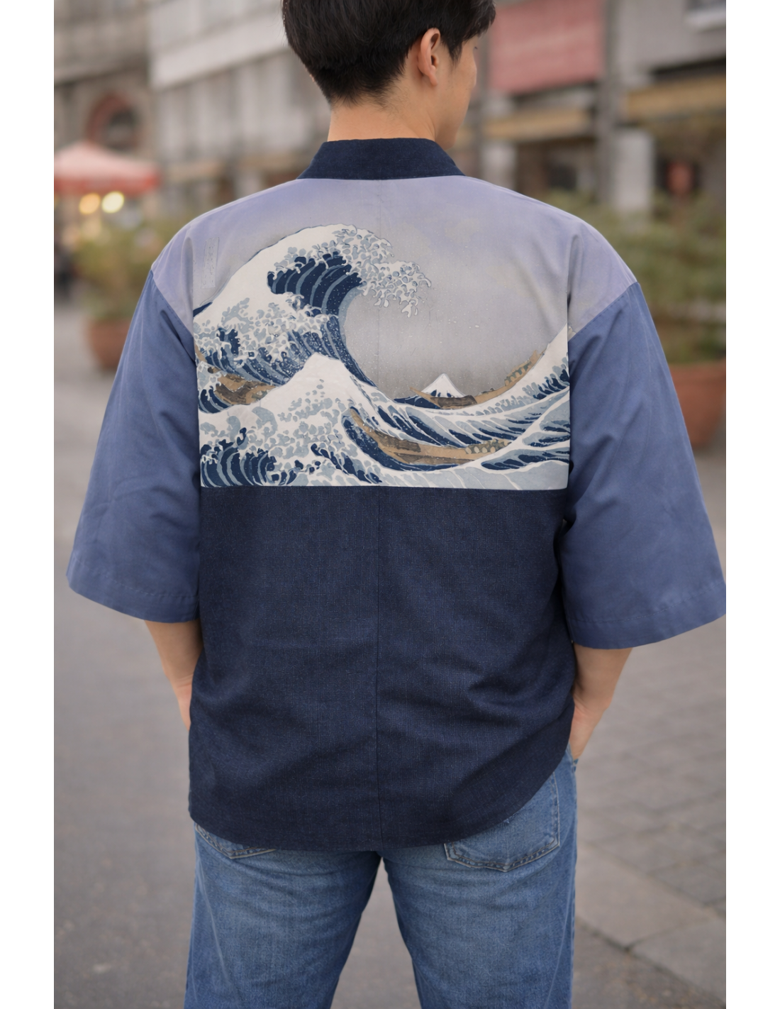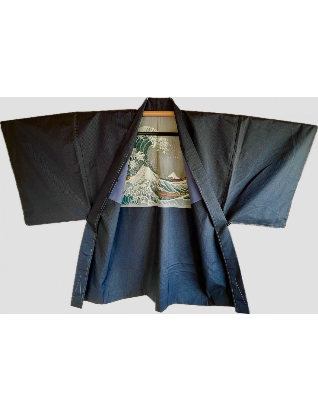 Antique Japanese men’s haori in blue Tsumugi silk, made in Japan, featuring a stunning lining inspired by Hokusai’s “Great Wave off Kanagawa.” A rare, elegant, and authentic piece, ideal for enthusiasts of traditional Japanese clothing, vintage textiles, and refined Japanese culture.