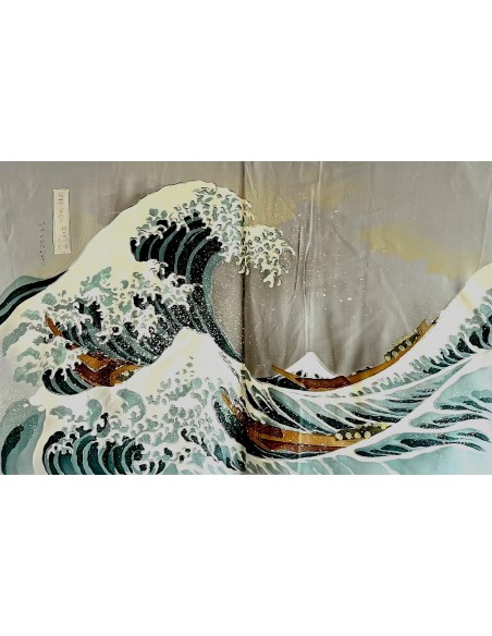 Discover a rare and authentic piece of Japanese textile heritage with this antique Japanese silk haori, carefully selected for its timeless elegance. Its understated exterior beautifully contrasts with a stunning inner lining inspired by Hokusai’s iconic “Great Wave off Kanagawa”, one of the most recognized images in Japanese art.