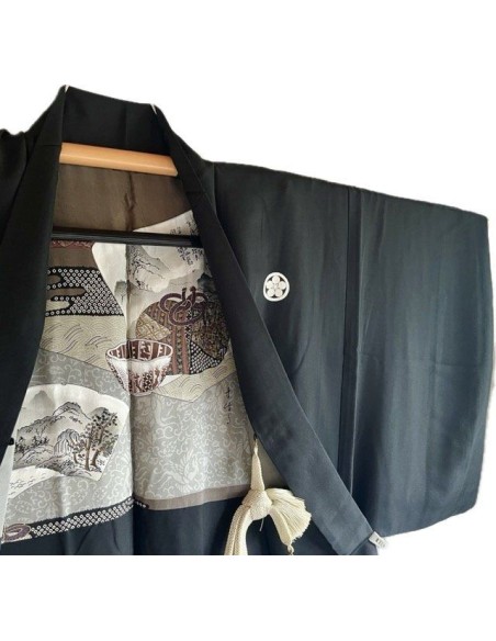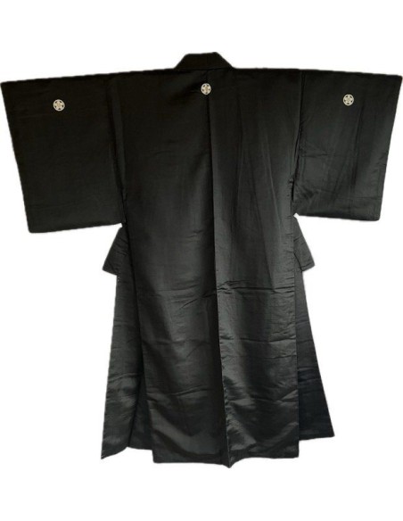 Elegant Japanese men’s set in black Habutae silk: kimono and haori adorned with five “Maru ni Umebachi” family crests. Handcrafted in Kyoto. Perfect for ceremonies, traditional arts, and collectors. Timeless refinement, smooth drape, and authentic craftsmanship. White himo cord included. DHL Express tracked shipping from Kyoto.