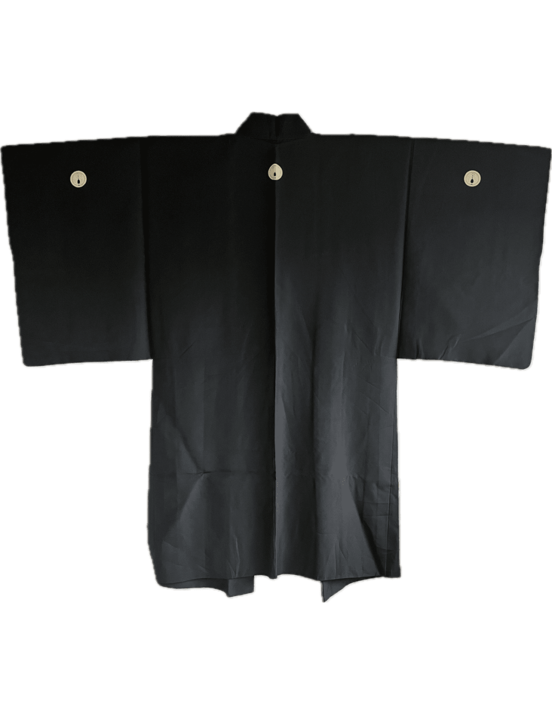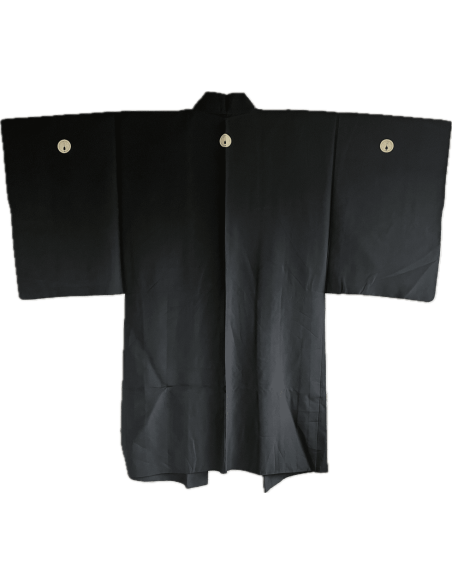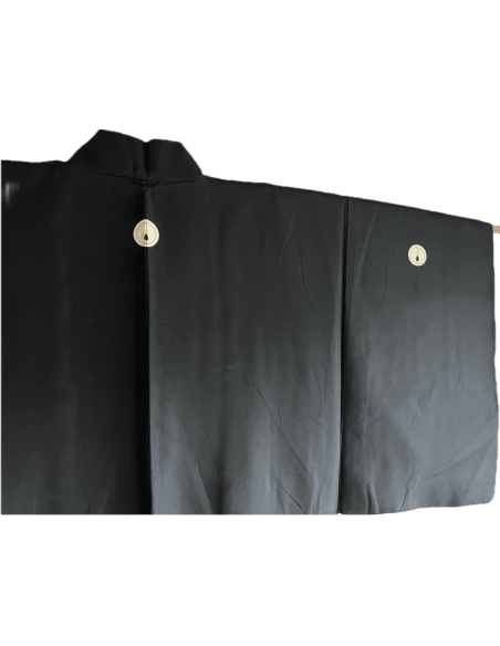 Discover this magnificent antique Japanese haori made from 100% pure black silk, a traditional garment of exceptional elegance. This Montsuki model features a discreet family crest on the back of the collar and chest, a sign of refined ceremonial attire.