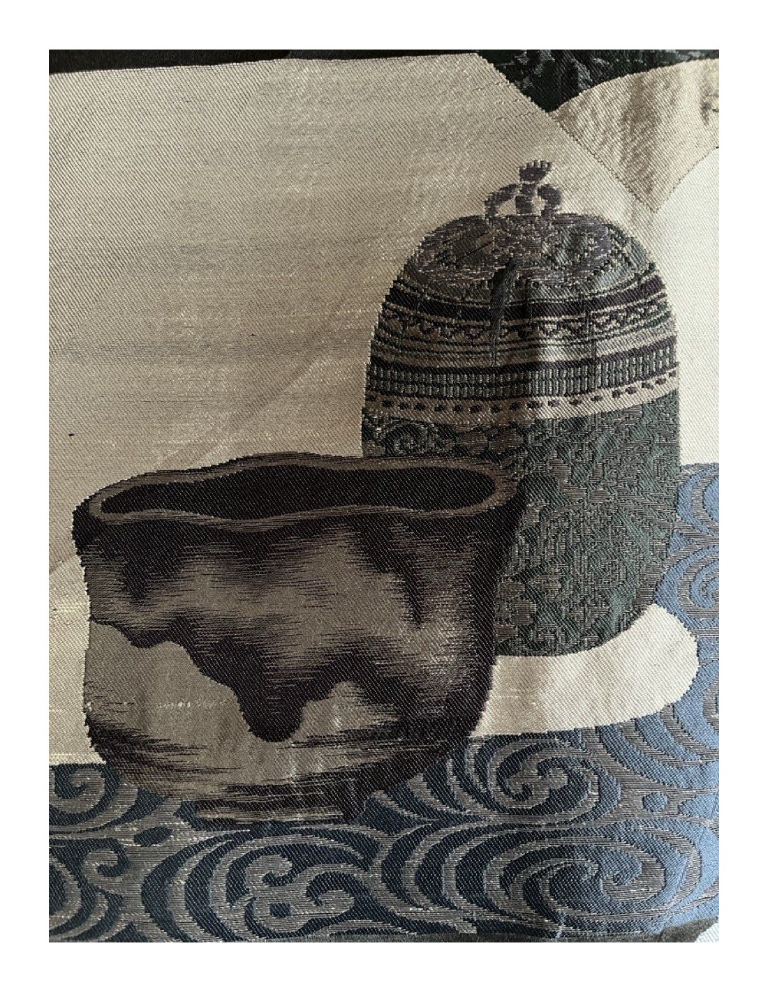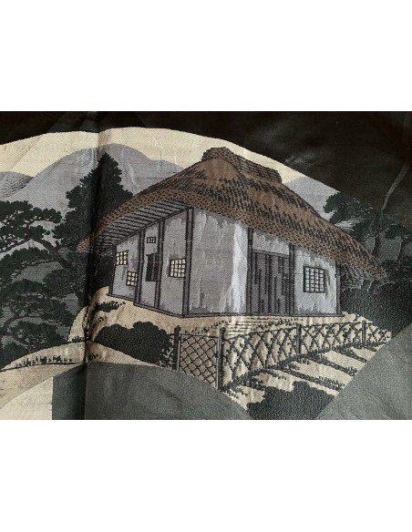 The interior is lined with marron rinzu silk with delicately stitched patterns depicting a traditional Japanese house and objects related to the tea ceremony . This haori is both reversible and decorative, making it perfect for daily wear or as a textile art piece for home decoration.