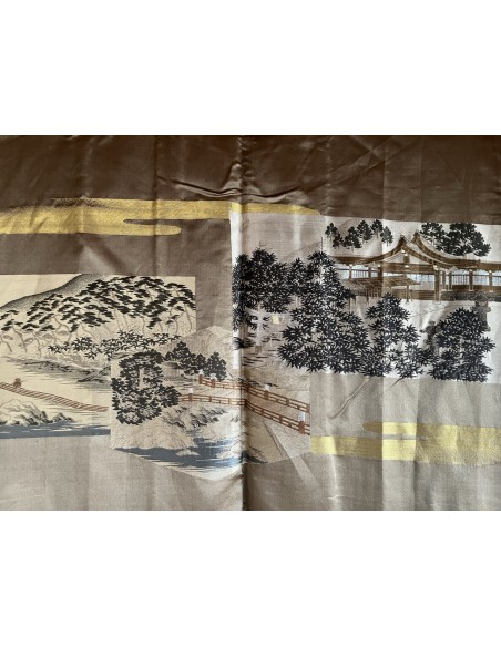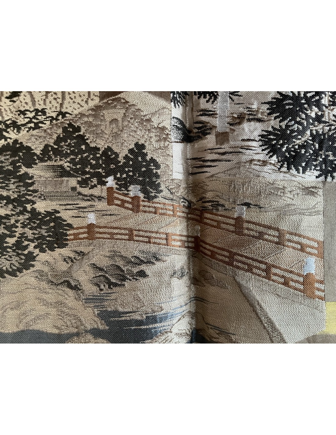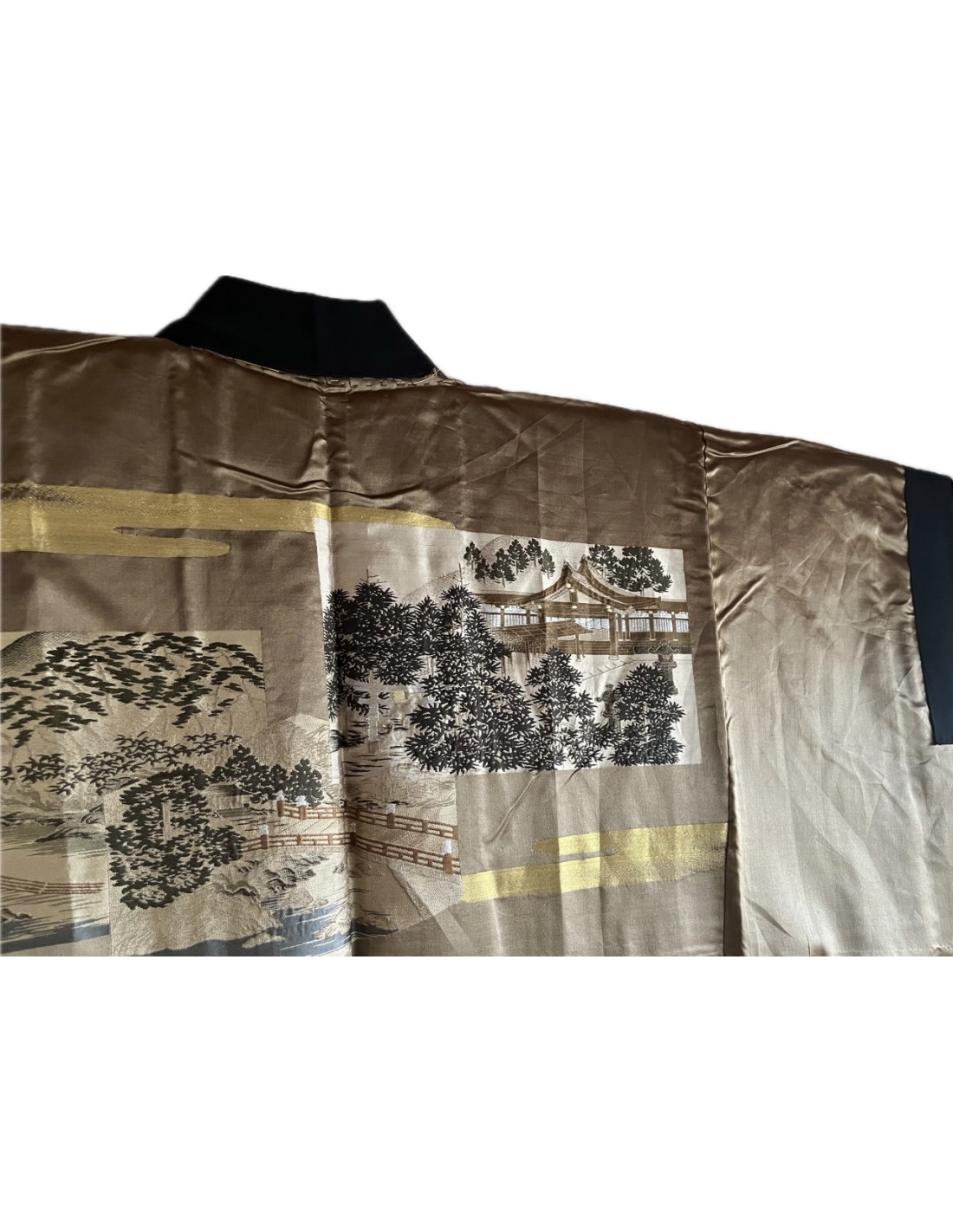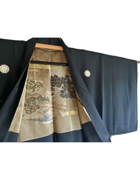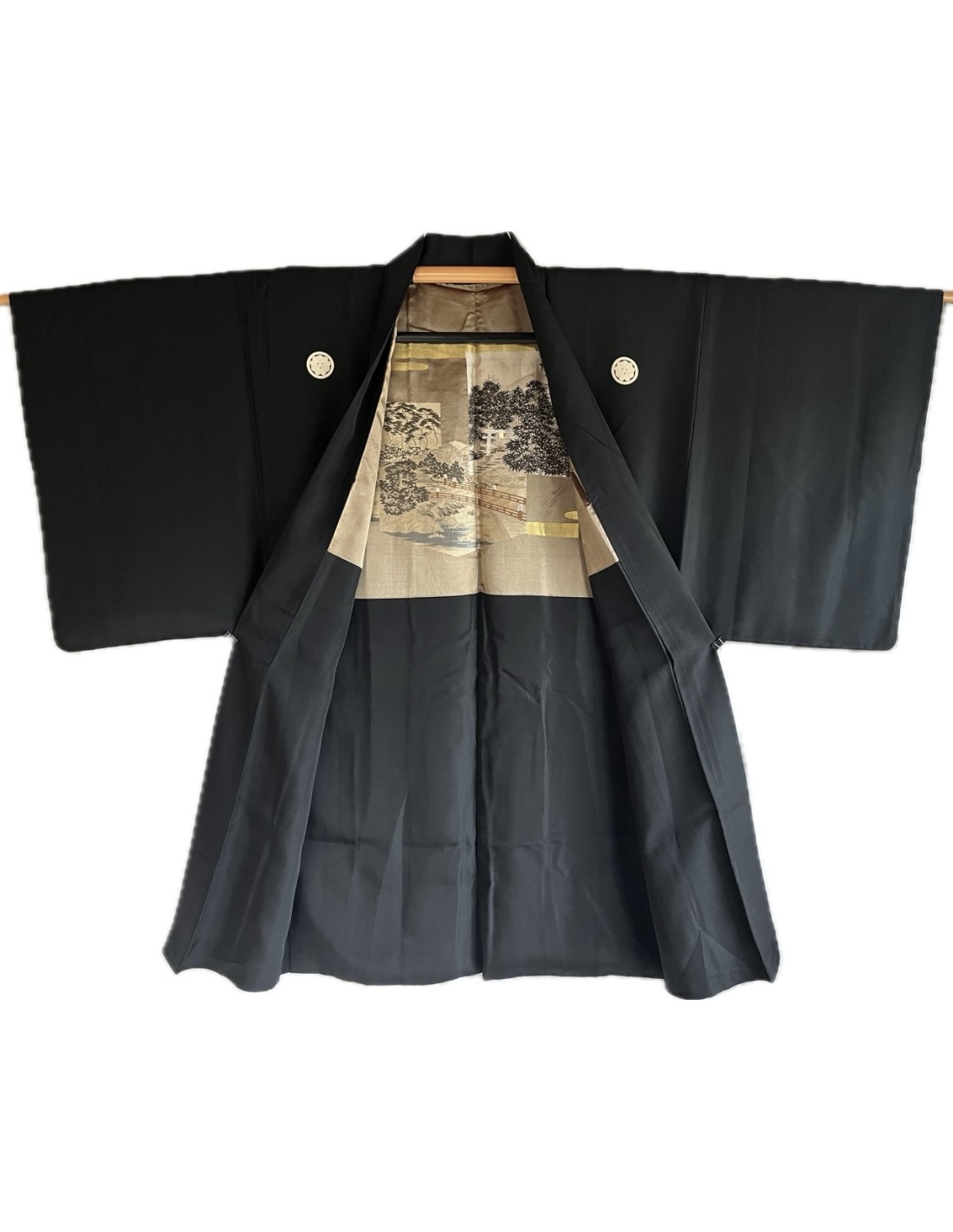 Elegant Japanese haori in black silk, adorned with 5 Kenkatabami family crests (Kamon). The refined lining features a Shinto shrine, a bridge, and golden clouds.