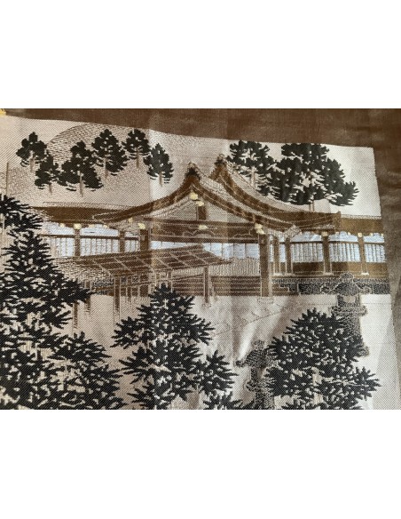 Japanese haori in black silk featuring the Kenkatabami (剣片喰) crest with an elegant lining depicting a Shinto shrine. Stylish and authentic, perfect for lovers of Japanese culture.