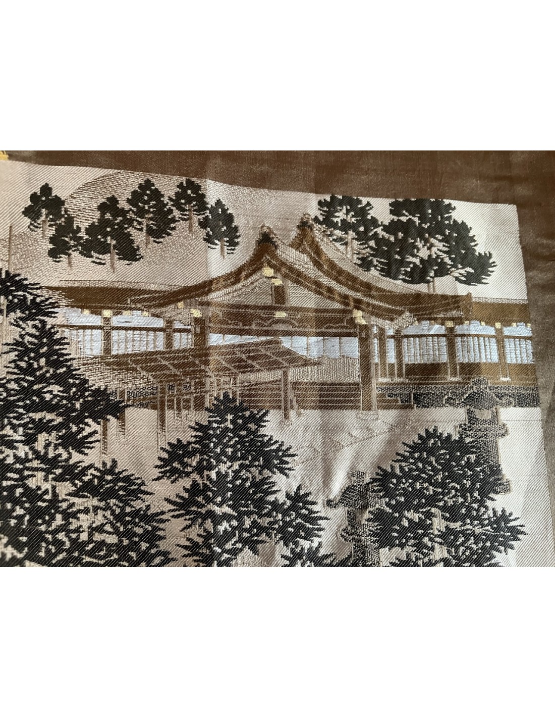 This montsuki haori (紋付羽織) in black silk is a traditional Japanese garment adorned with the historical Kenkatabami (剣片喰) family crest. The inside lining showcases a refined illustration of a Shinto shrine, a bridge, and golden clouds, adding an elegant and spiritual aesthetic.