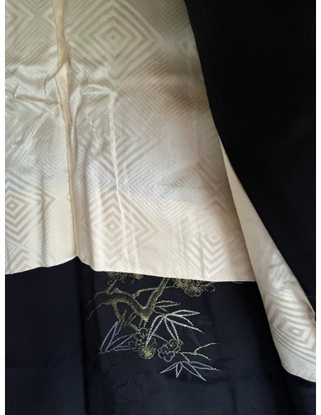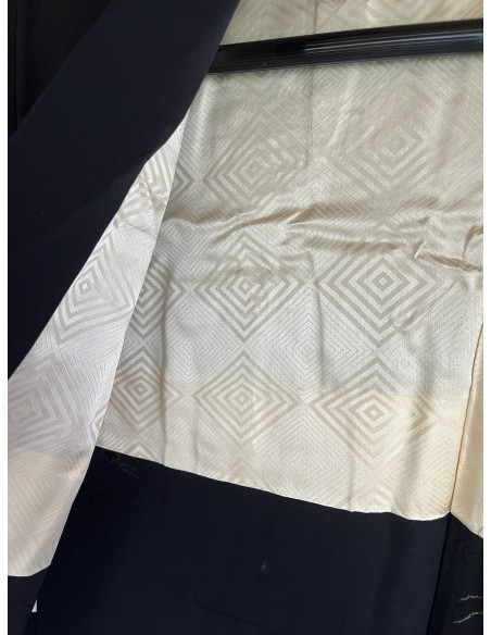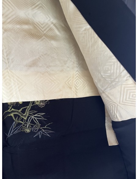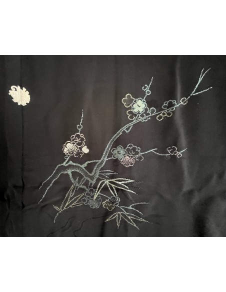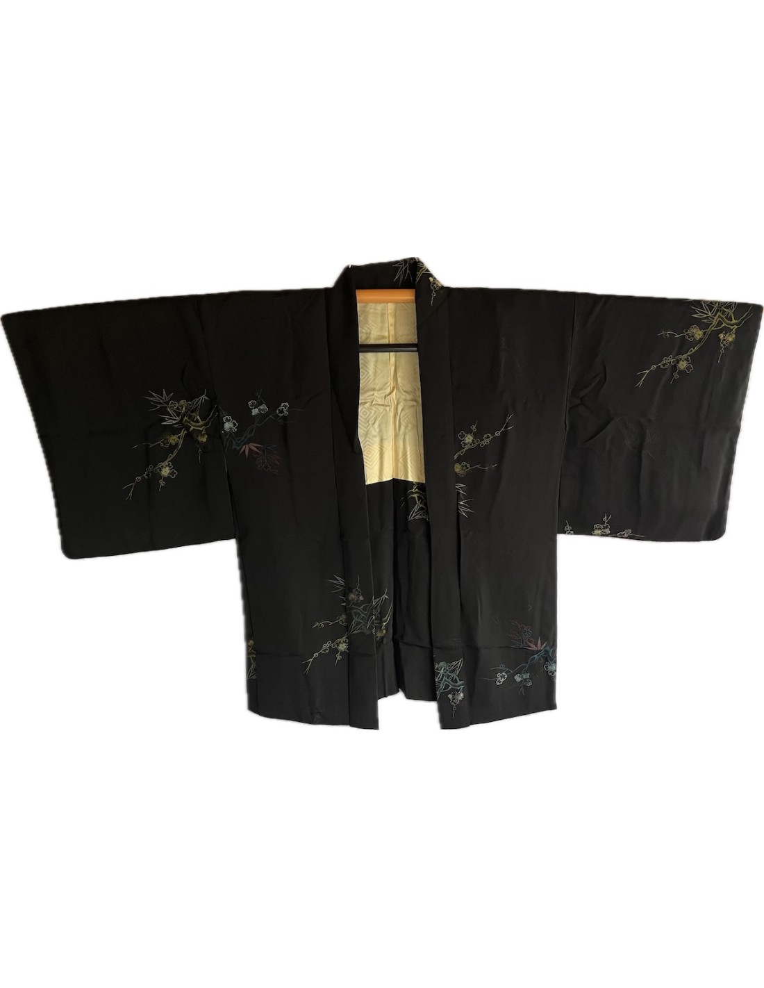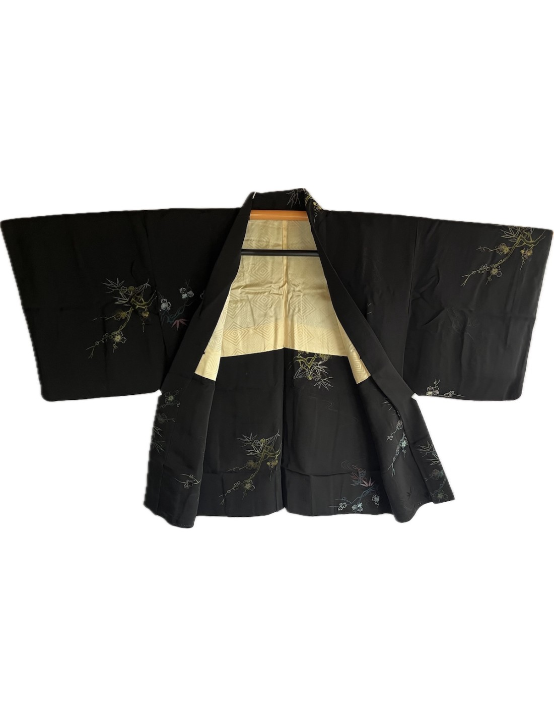 Elegant vintage haori in fine black silk, formal montsuki style featuring a single Agehachō kamon (swallowtail butterfly) on the back. Embroidered Shochikubai floral trio (pine, bamboo, plum) and inner lining in ivory silk with sayagata pattern. Rare and timeless piece of Japanese heritage.
