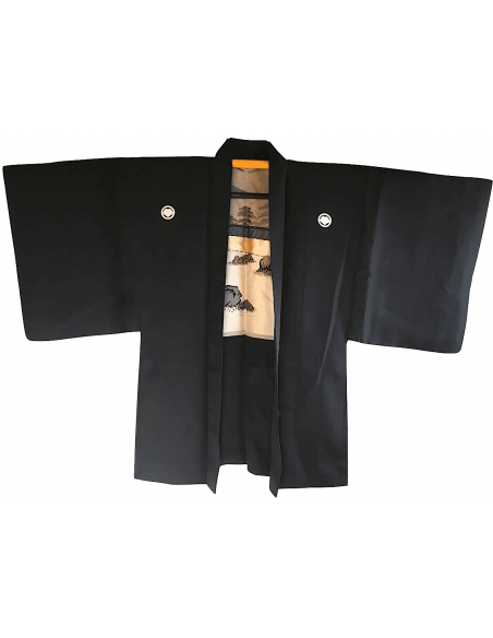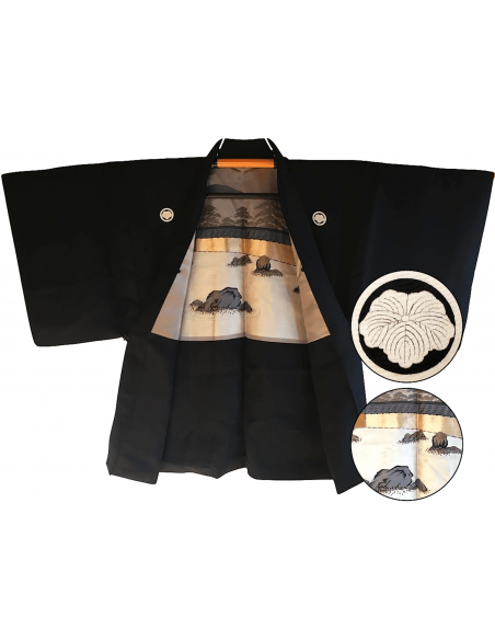 Élégant haori japonais en soie noire, orné de 5 armoiries Kenkatabami. Sa doublure raffinée représente un sanctuaire Shinto, un pont et des nuages dorés.