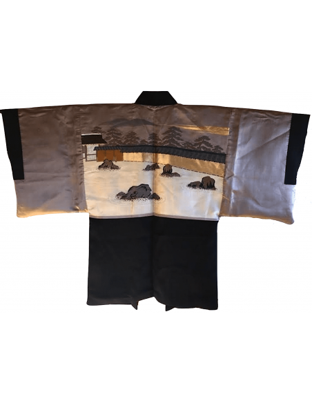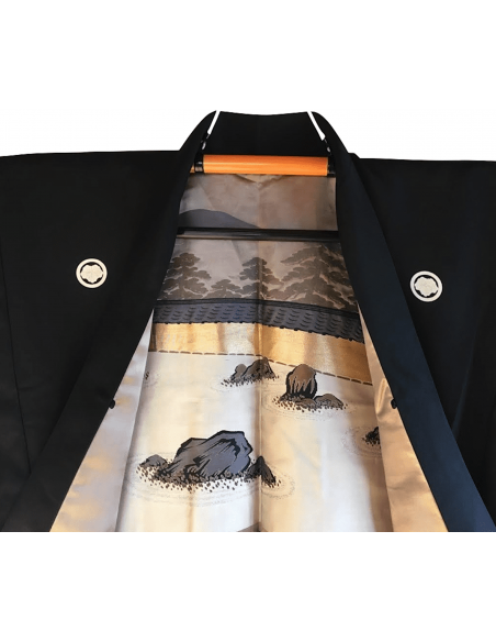 Haori Japonais homme soie noire Tsuta Montsuki Jardin Zen Ryoanji