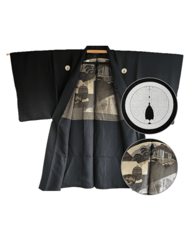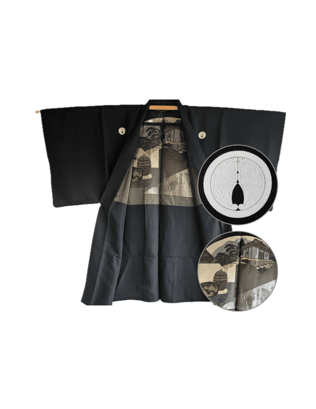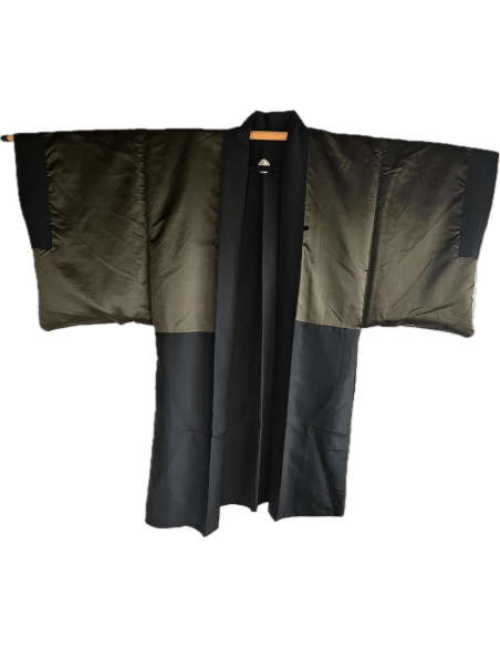 Découvrez ce superbe haori japonais antique  en soie noire 100 % pure, un vêtement traditionnel d’une élégance rare. Ce modèle Montsuki arbore un blason familial discret sur l’arrière du col et la poitrine, témoignage du raffinement des vêtements de cérémonie.