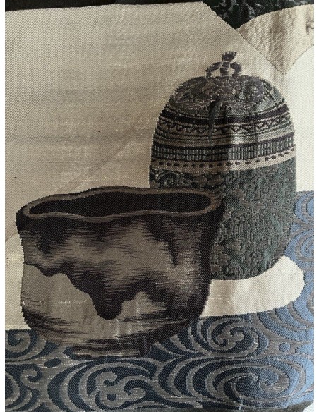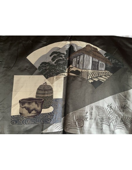 L’intérieur est doublé en soie marron rinzu  avec des motifs finement surpiqués représentant une maison traditionnelle japonaise et des objets liés à la cérémonie du thé . Ce haori, à la fois réversible et décoratif, peut être porté au quotidien ou utilisé comme pièce d’art textile pour embellir un intérieur.