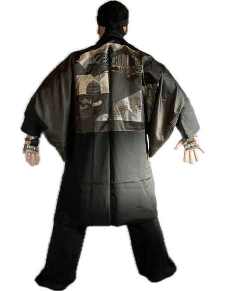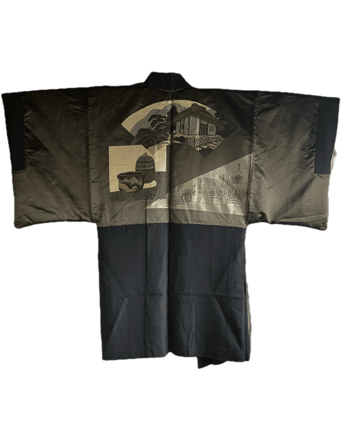Élégant haori japonais en soie noire 100 %, doublé en soie rinzu avec motifs de cérémonie du thé. À porter sur un keikogi d’Iaido, un kimono ou avec un jean et un t-shirt pour un style contemporain.