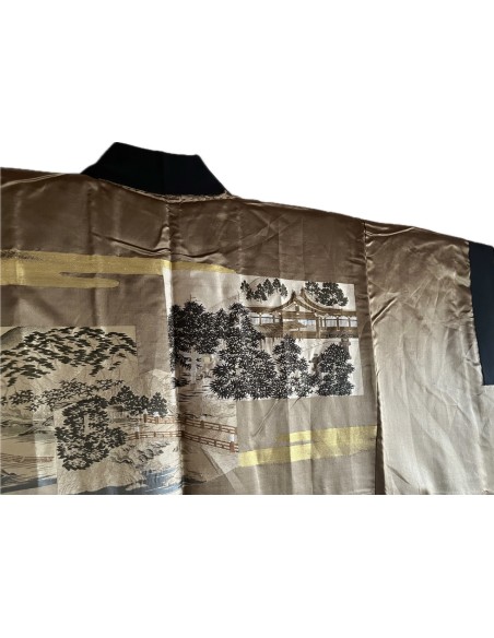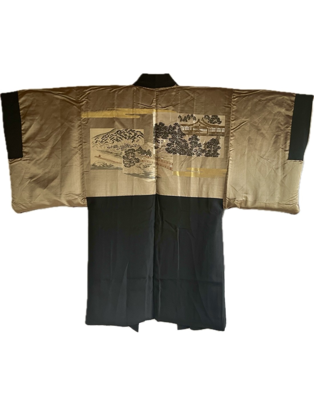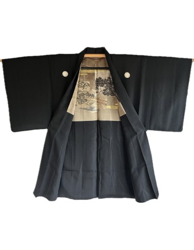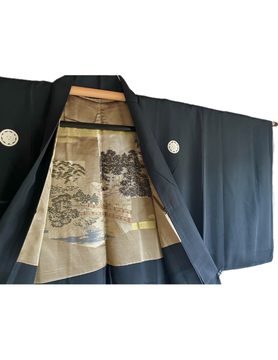 Élégant haori japonais en soie noire, orné de 5 armoiries Kenkatabami. Sa doublure raffinée représente un sanctuaire Shinto, un pont et des nuages dorés.